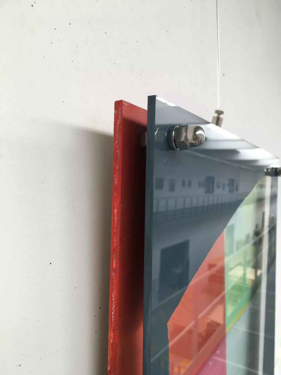 Lasuren wurden auf eine Holzplatte aufgetragen. Darüber wurde eine Plexiglasscheibe, die ebenfalls gestaltet wurde, mit hochwertigen Edelstahl-Schrauben verbunden. Beide Platten haben einen Abstand von ca. 3 cm. Somit wandern die Ausschnitte umher.