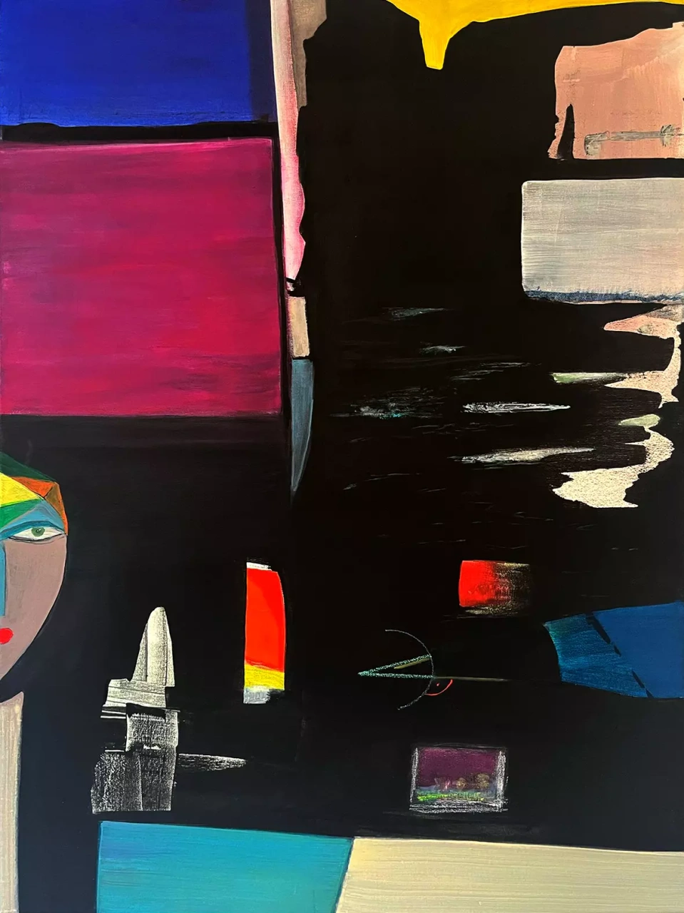 Eine gelenkte Schüttung bildete den Begin. Bildausschnitte formierten sich und dringen durch das Schwarz. Der Kampf um Vordergrund und Hintergrund, Kalt-Warm-Kontrast und starren, bzw fließenden Formen beginnt.