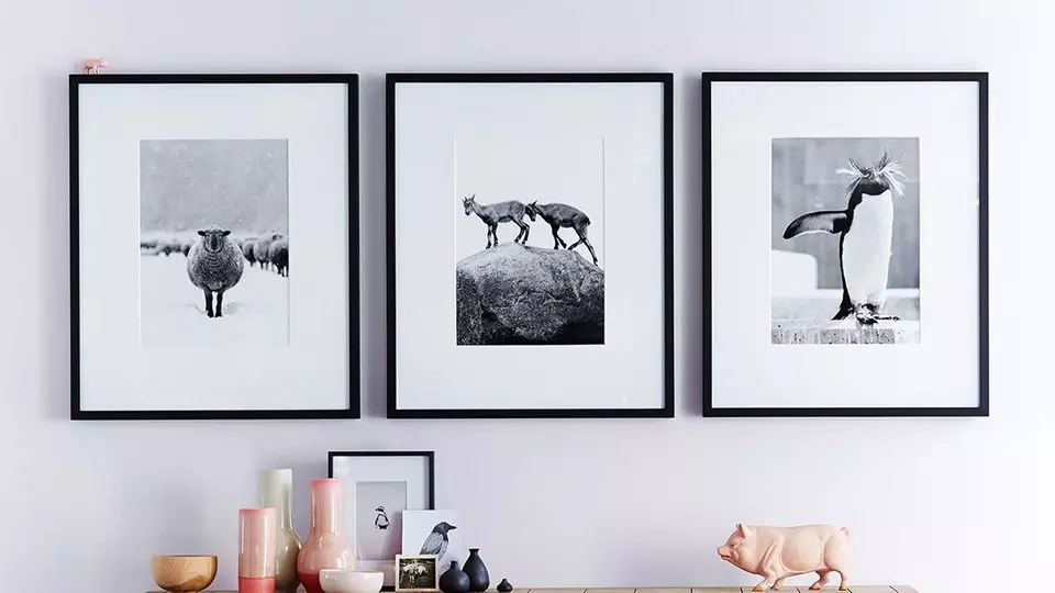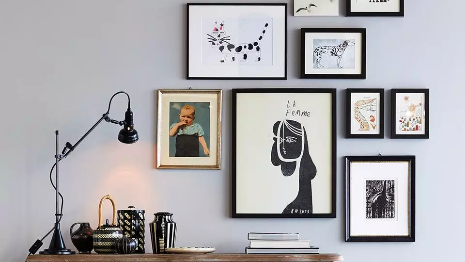 Die symmetrische Hängung folgt – wie der Name schon sagt – einem ausgewogenen und harmonischen Aufbau. Besonders geeignet ist sie ab drei Bildern aufwärts. Dabei werden die Werke so platziert, dass ein Gleichgewicht auf beiden Seiten entsteht – sei es in Form eines Rasters, einer Kreuzform oder einfach durch einen spiegelbildlichen Aufbau. Tipp: Vor dem Bohren unbedingt eine Probelegung am Boden machen – das erleichtert die spätere Umsetzung und vermeidet unnötige Löcher.