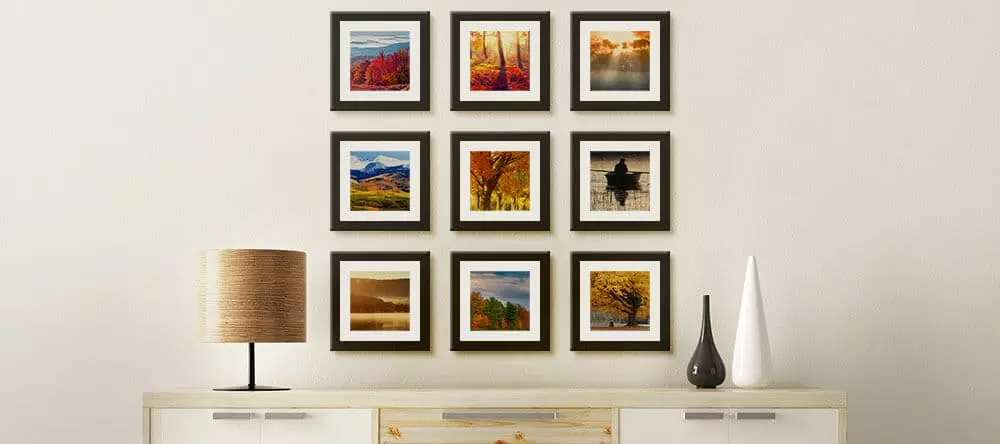 Die Rasterhängung ist die Königin der Ordnung. Hier werden mehrere Bilder in gleichmäßigen Abständen sowohl vertikal als auch horizontal angeordnet – wie auf einem unsichtbaren Gitter. Besonders gut funktioniert diese Hängung mit gleich großen Rahmen und ähnlichen Motiven, zum Beispiel bei Fotografien oder Grafiken. Das Ergebnis: eine ruhige, moderne und sehr strukturierte Wirkung. Ideal für minimalistisch eingerichtete Räume oder für alle, die Kunst gerne in Serien präsentieren. Auch in Galerien oder modernen Wohnräumen kommt diese Art der Hängung wunderbar zur Geltung.